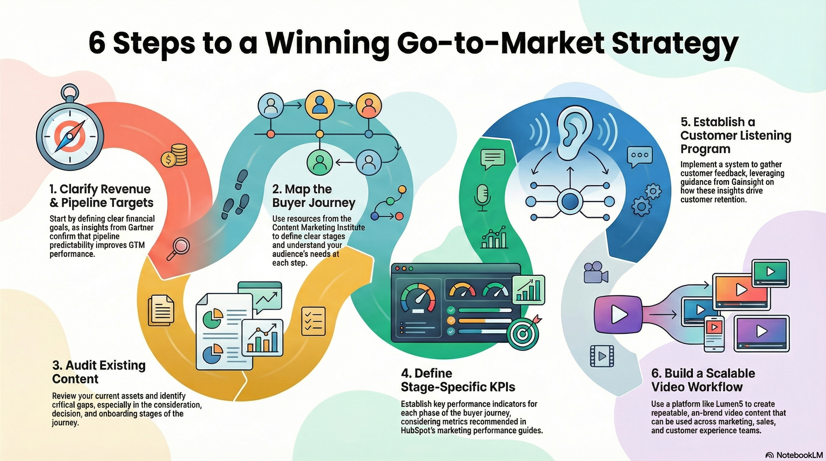 Start with revenue alignment, map the buyer journey, audit your content, define KPIs, build a listening loop, and adopt a scalable video workflow.