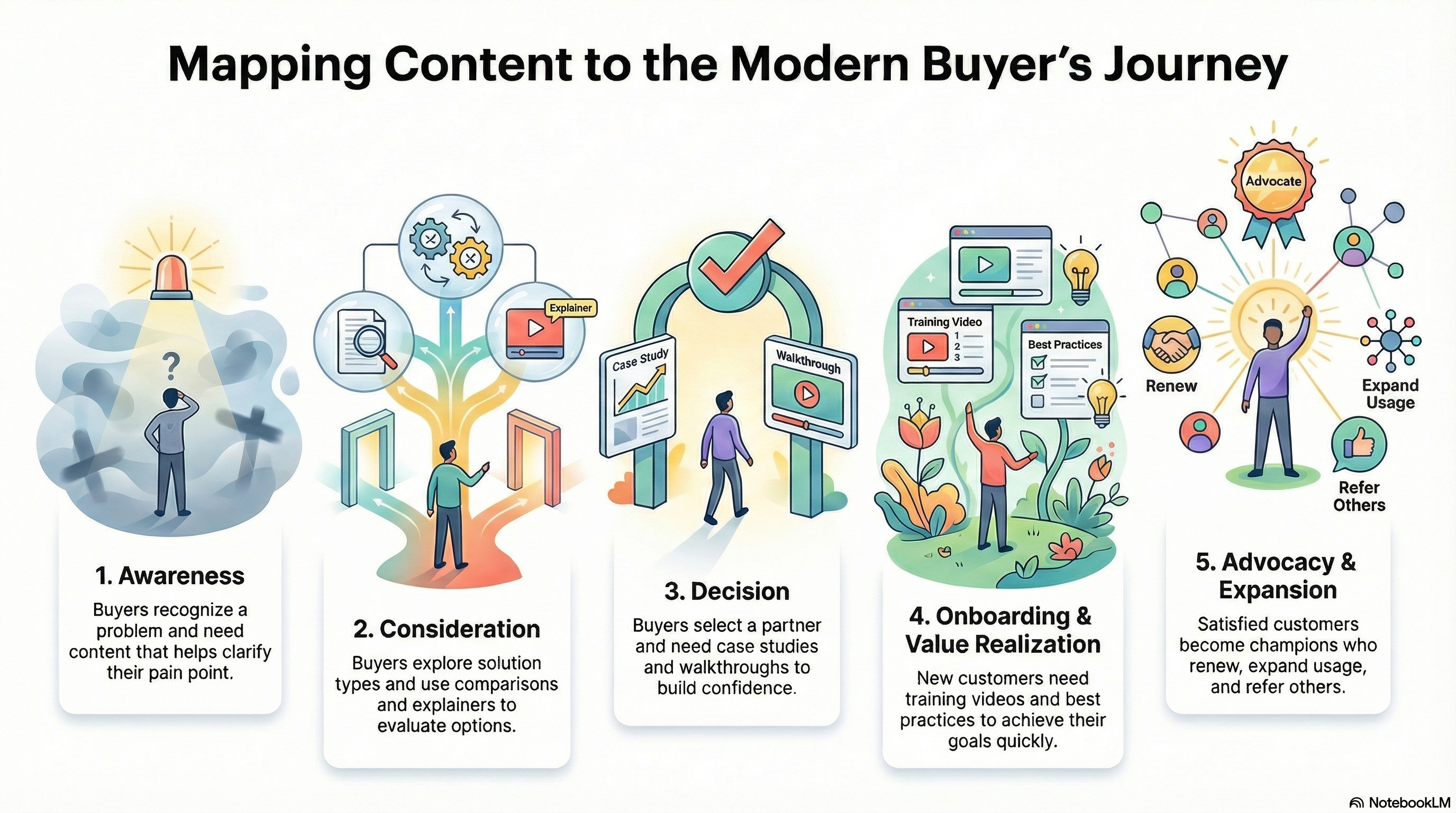 It is a buyer journey where customers rely on content to educate themselves long before speaking with sales. Marketing, sales, and CX must support every stage with helpful, relevant content.