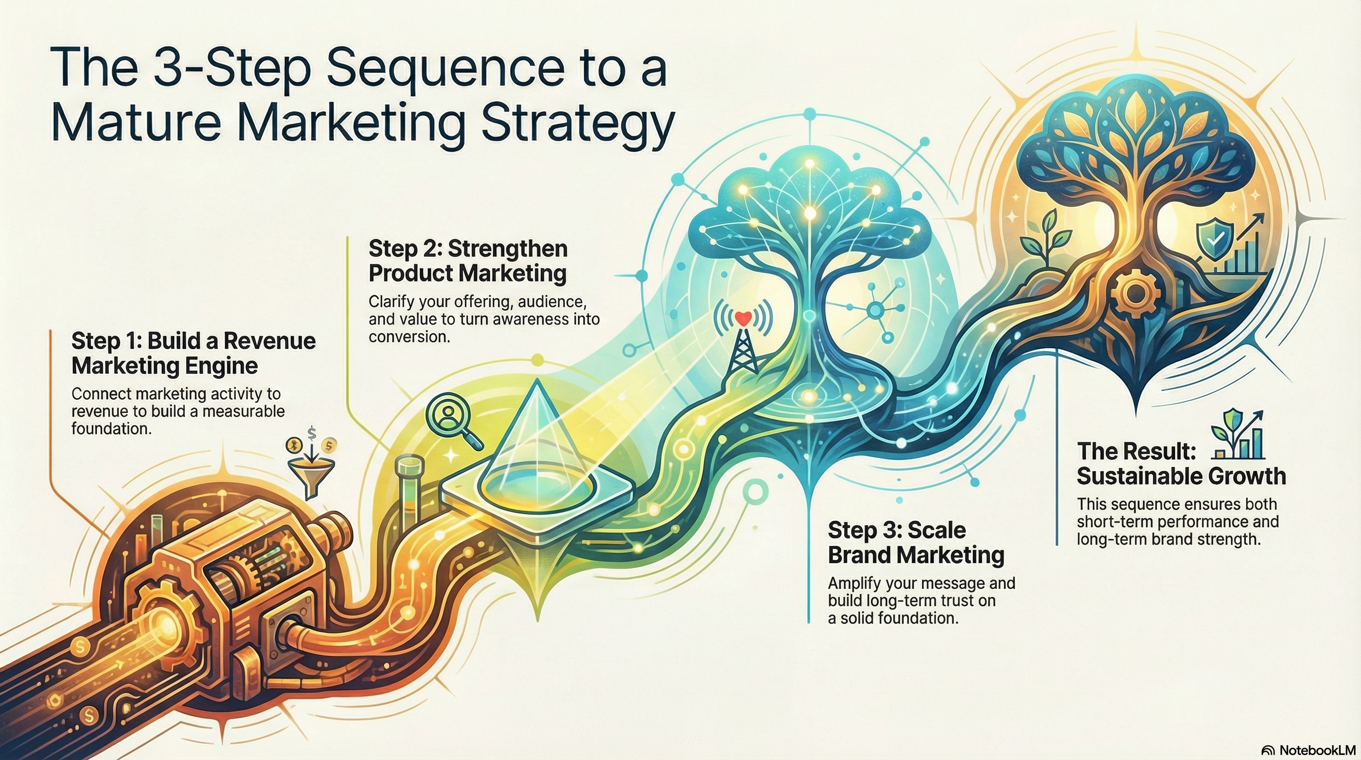 Many companies struggle because they invest heavily in brand activity before establishing the fundamentals that drive measurable growth. Pius emphasizes that successful marketing maturity follows a clear sequence. Each stage builds the stability and clarity required for the next, and skipping ahead often leads to wasted resources and inconsistent results.